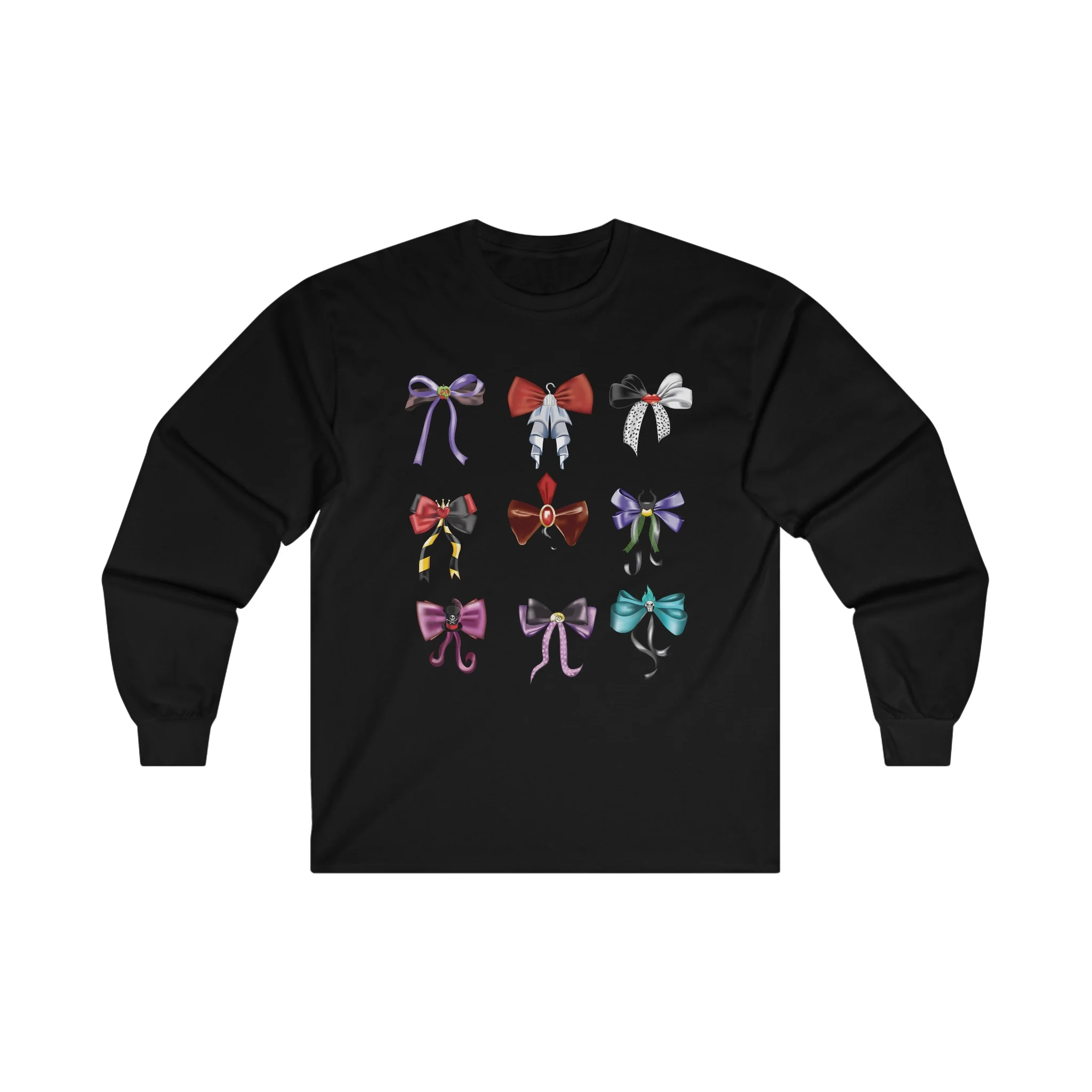 Unleash your inner baddie with our Villain-Inspired Bows! These bows are perfect for adding a touch of mischief to your everyday look with this long sleeve tee.